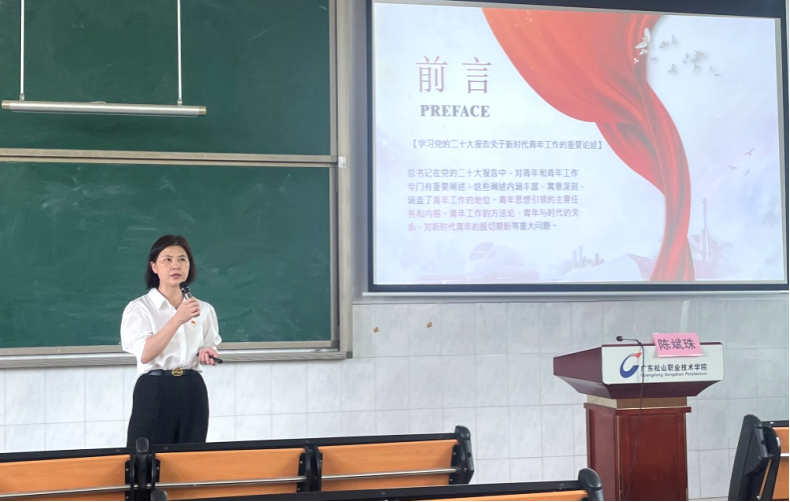 开班仪式结束后,陈斌珠以《学习党的二十大精神 勇担复兴重任 争做时代新人》开启了本期培训班理论学习的第一讲,带领全体学员深入学习党的二十大报告中关于新时代青年工作的重要论述。学习内容涵盖了青年工作的地位、青年思想引领的主要任务和内容、青年工作的方法论、青年与时代的关系、对新时代青年的殷切期盼等重大问题。陈斌珠深切寄语全体学员要认真学习贯彻党的二十大精神,立足新时代新征程,以青春之我、奋斗之我,争做堪当民族复兴重任的时代新人。